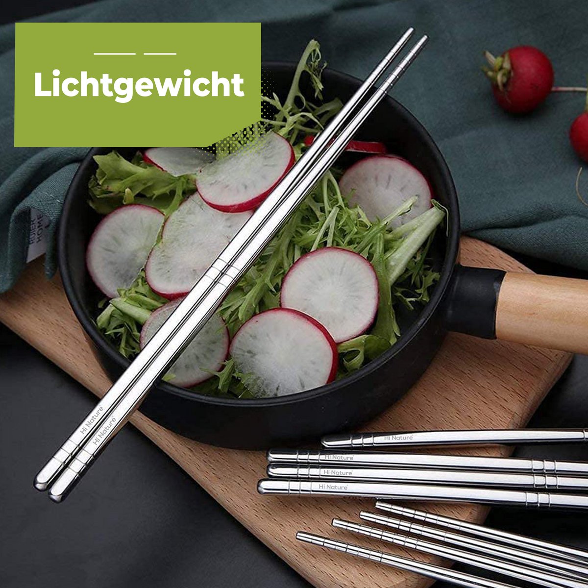 De HI NATURE™ eetstokjes zijn gemaakt van hoogwaardig roestvrij staal, wat ze niet alleen stevig en duurzaam maakt, maar ook roestbestendig en vaatwasserbestendig. In tegenstelling tot houten of plastic eetstokjes gaan deze metalen eetstokjes jarenlang mee zonder te buigen of te verslijten.