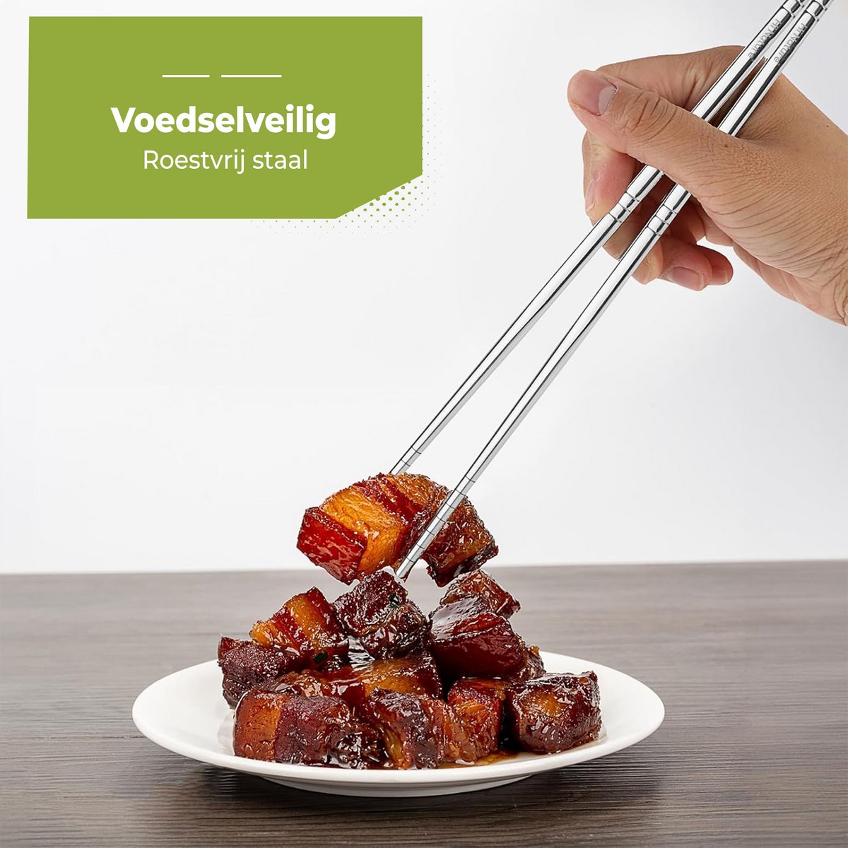 Deze luxe eetstokjes zijn niet alleen geschikt voor dagelijks gebruik, maar ook perfect voor feestelijke diners of als stijlvolle toevoeging aan je tafelsetting. De strakke, zilveren afwerking geeft een moderne en verfijnde uitstraling die past bij elke keuken en eetkamer.