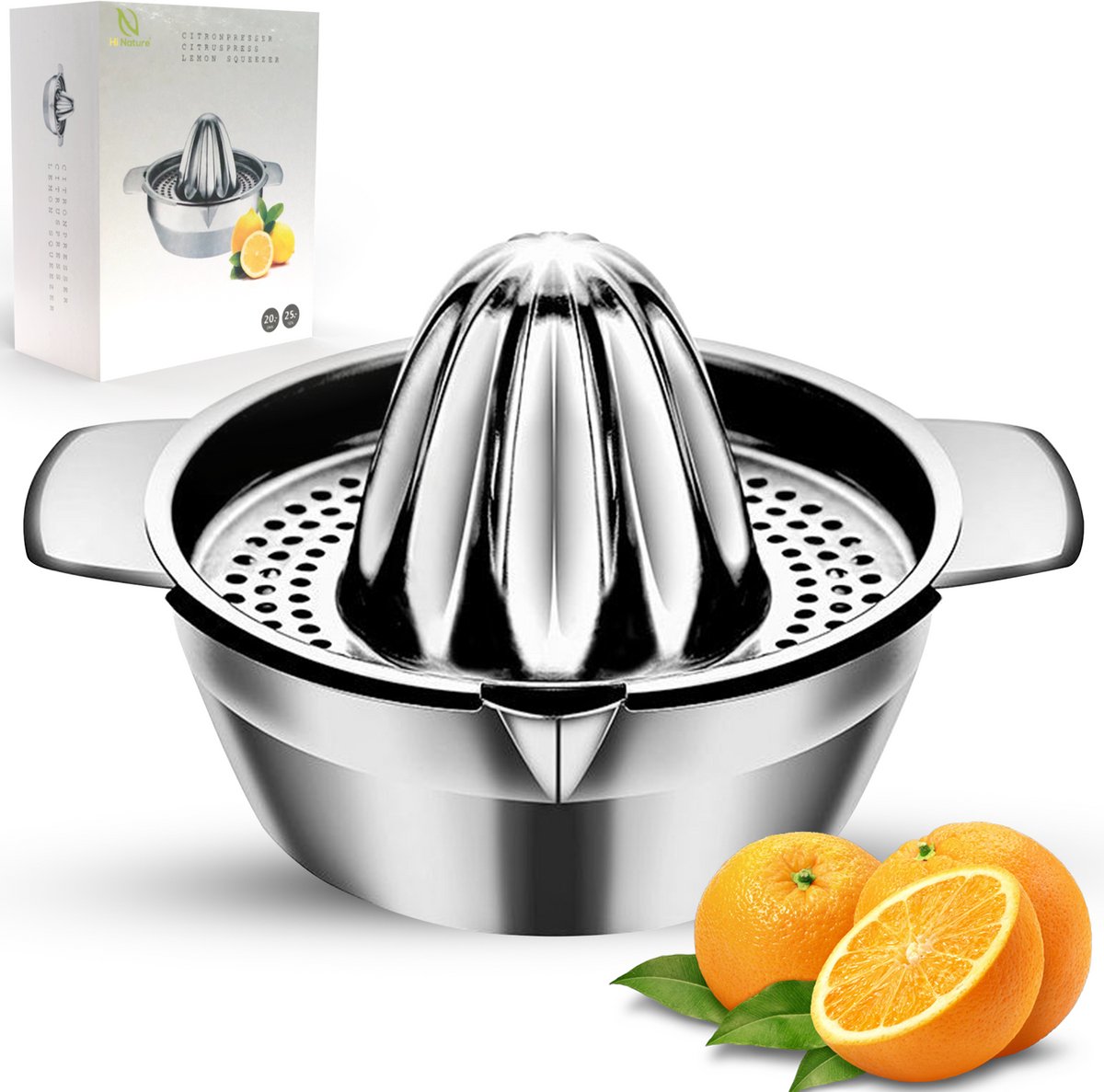 Begin je dag met een glas vers geperst sap met de Hi Nature Citrus Juicer – een robuuste en stijlvolle handpers van roestvrij staal. Dankzij het stevige ontwerp en de ingebouwde zeef pers je moeiteloos sinaasappels, citroenen, limoenen en grapefruits zonder geknoei. De duurzame constructie, gemakkelijke reiniging en efficiënte sapafvoer maken dit de ideale sapmaker voor dagelijks gebruik in elke keuken. Perfect voor wie houdt van pure, natuurlijke smaak zonder gedoe met elektrische apparaten.