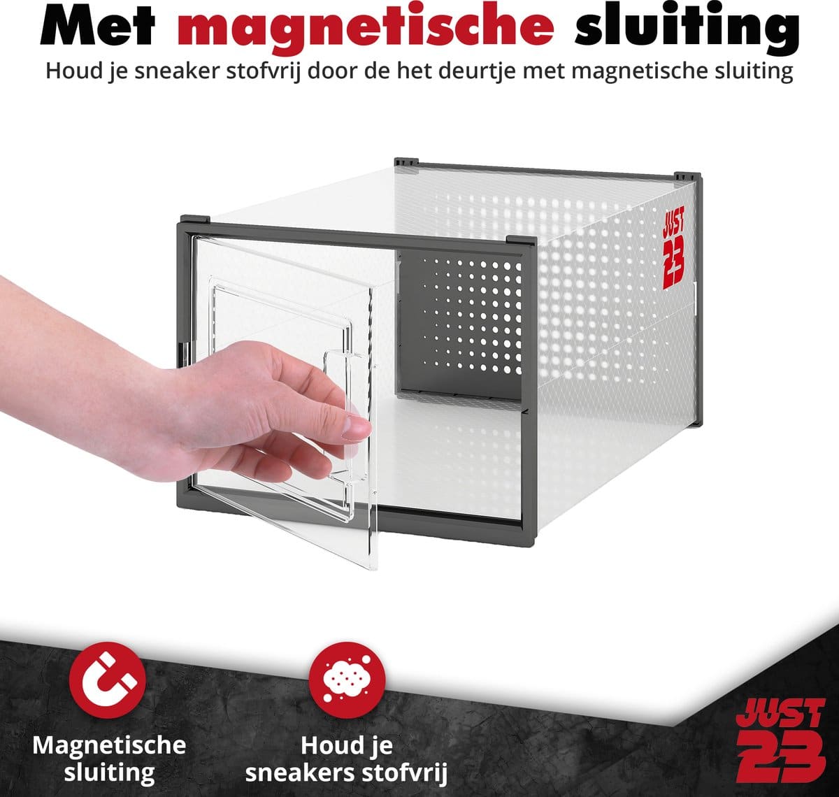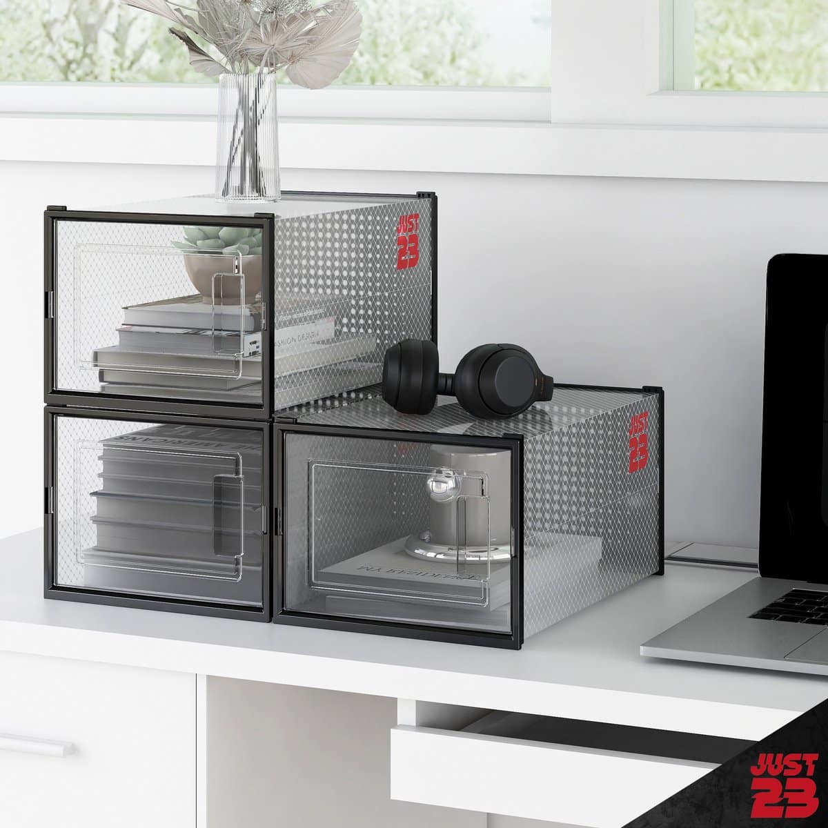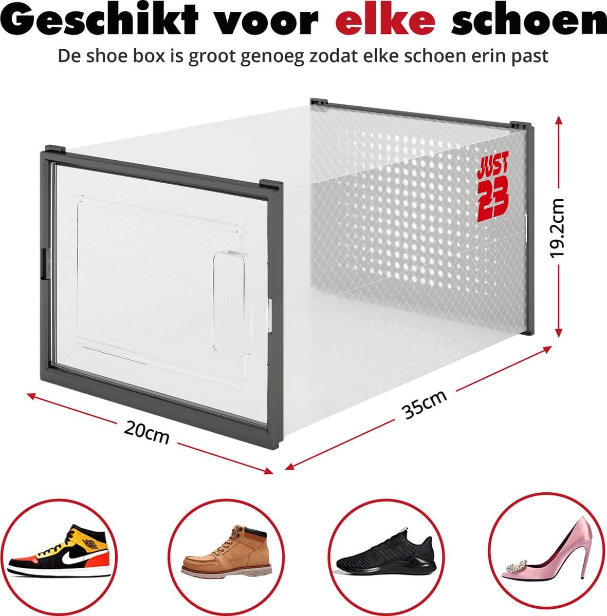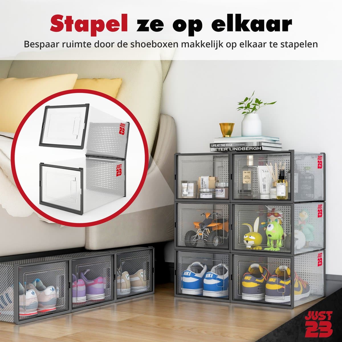 De JUST23 opbergboxen zijn gemaakt van stevig en transparant kunststof, waardoor ze langdurig meegaan en eenvoudig schoon te maken zijn. De boxen zijn stapelbaar, waardoor je ruimte optimaal benut wordt, en hun strakke ontwerp past perfect in elke kamer of kast. Ideaal voor het beschermen van je schoenen en andere waardevolle items!