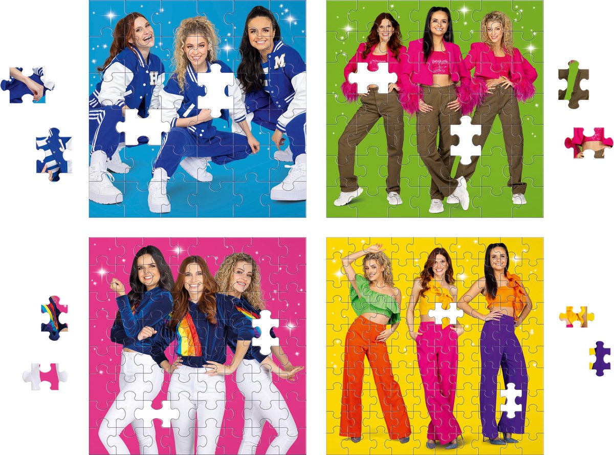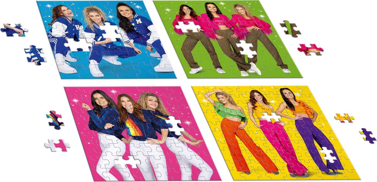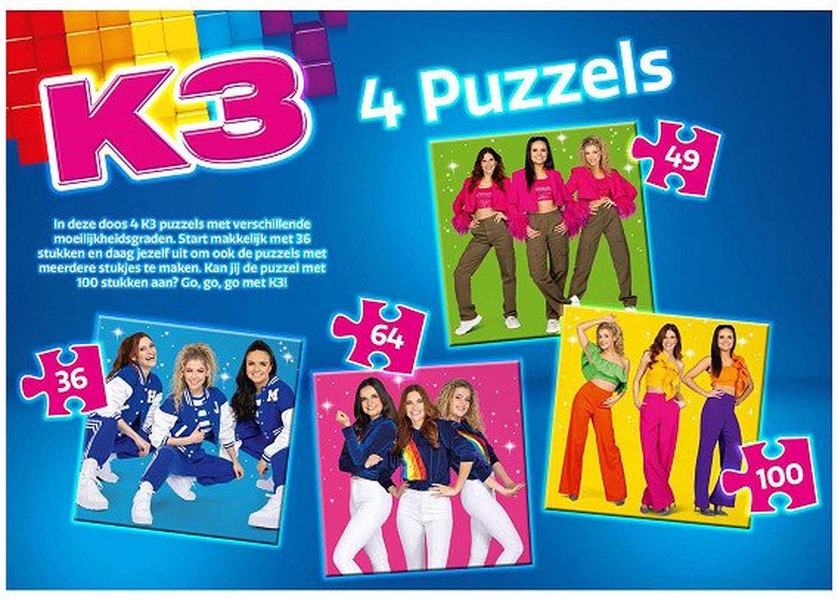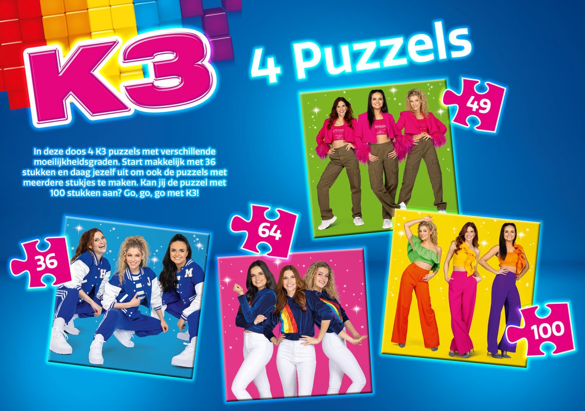 In deze doos zitten 4 K3 puzzels met verschillende moeilijkheidsgraden. Start makkelijk met 36 stukken en daag jezelf uit om ook de puzzels met meerdere stukjes te maken. Kan jij de puzzel met 100 stukken aan? Go, go, go met K3!