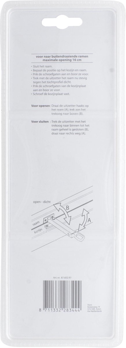 De raamvastzetter is geschikt voor naar buiten draaiende bovenlichten, voor klepramen en voor uitzetramen. Door deze raamuitzetter zorg jij ervoor dat jouw open raam vast staat en dus niet kan gaan klapperen. De maximale opening van deze vastzetter is ongeveer 16 centimeter. Daarnaast is de hendel van de uitzetter wegdraaibaar waardoor hij parallel aan de vensterbank kan worden gezet.