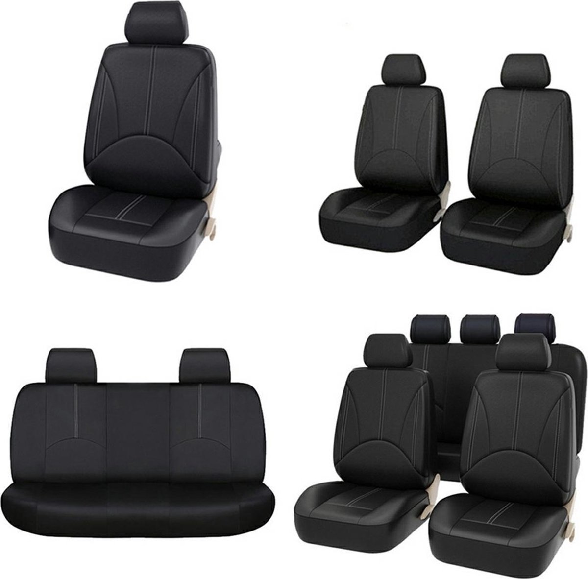 1x stoelhoes voor (links) 1x stoelhoes voor (rechts) 5x hoes voor hoofdsteunen voor en achter 1x achterbank hoes 1x rugleuning hoes Allemaal verpakt in een esthetische tas