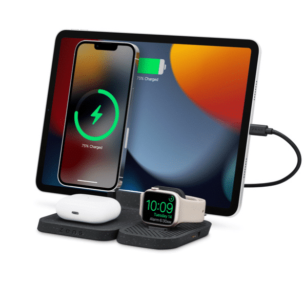 De modulaire 4-in-1 draadloze oplader van Zens is een handige en duurzame oplossing om al je Apple devices zo snel mogelijk op te laden. Het basisstation laadt je iPhone, iPad en AirPods op. De modulaire uitbreiding voor Apple Watch klik je magnetisch vast op het basisstation en wordt van stroom voorzien via de aangesloten lichtnetadapter. Al je Apple devices in dezelfde oplader zorgt voor een gerust gevoel en ziet er ook nog eens netjes uit. Officieel MagSafe voor de hoogst mogelijke laadsnelheid tot 15 W voor iPhone 12-, iPhone 13- en iPhone 14-modellen. USB-C-poort op de draadloze oplader levert maximaal 30 W vermogen. Je iPad opladen en tegelijkertijd draadloos je iPhone en AirPods opladen. De modulaire uitbreiding voor Apple Watch kun je naar keuze vastklikken op het basisstation of als zelfstandige oplader gebruiken.